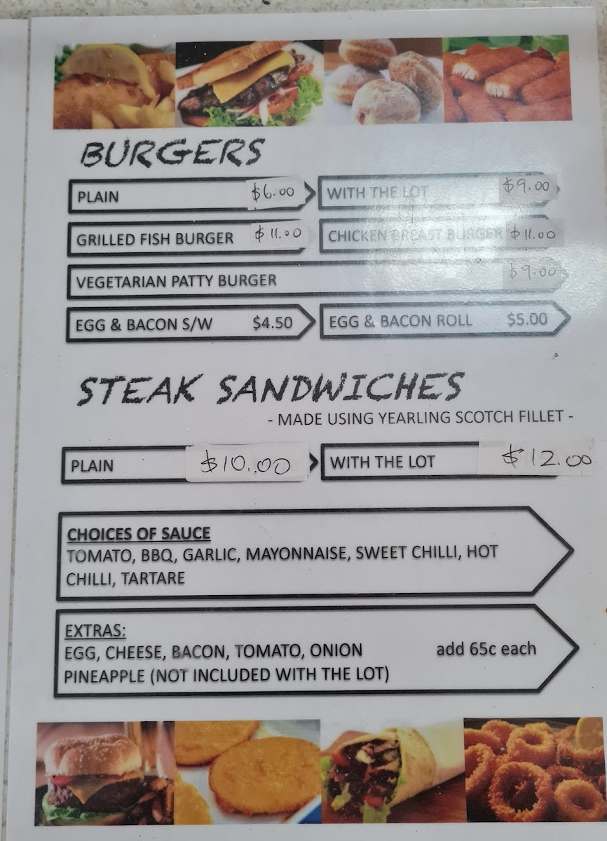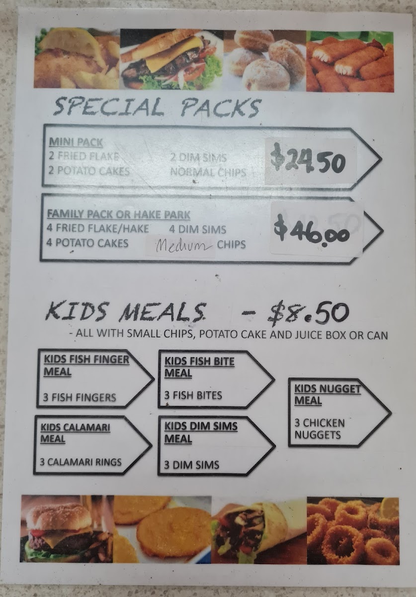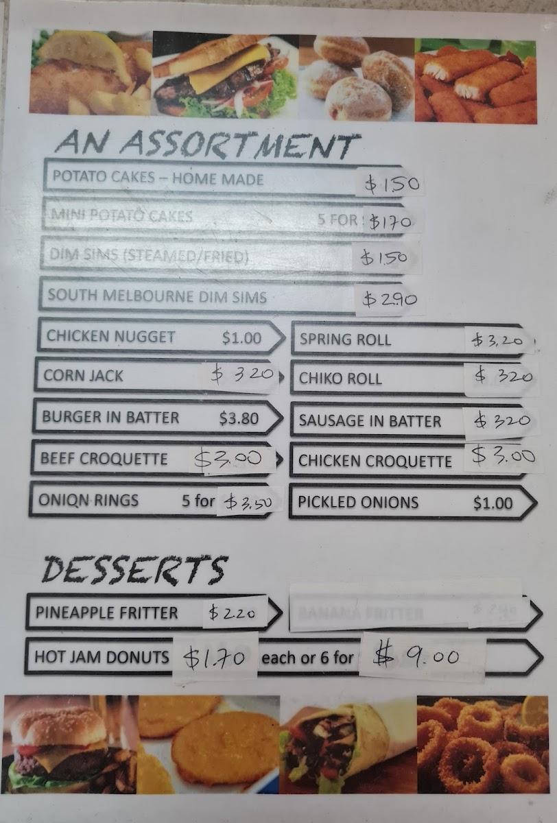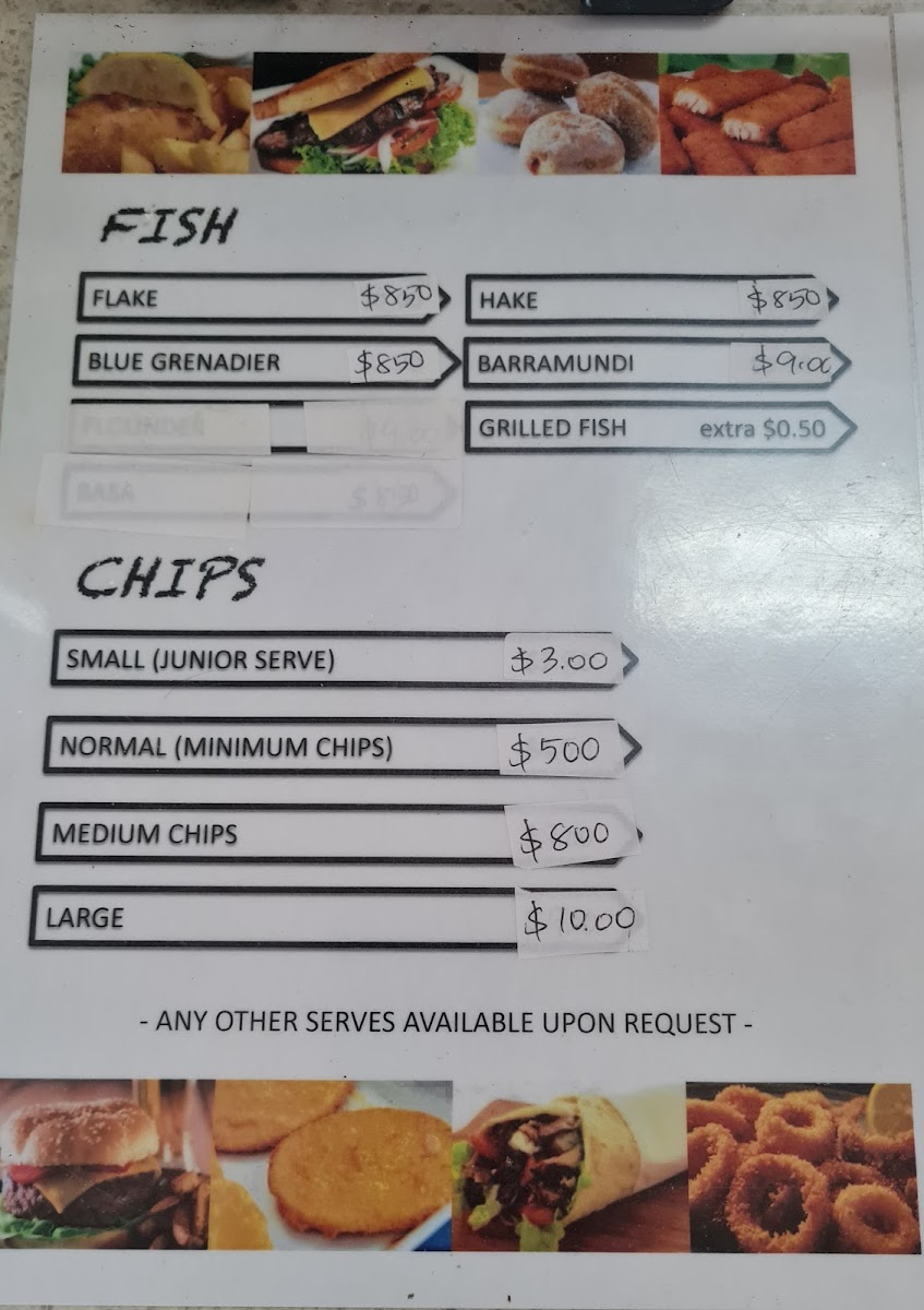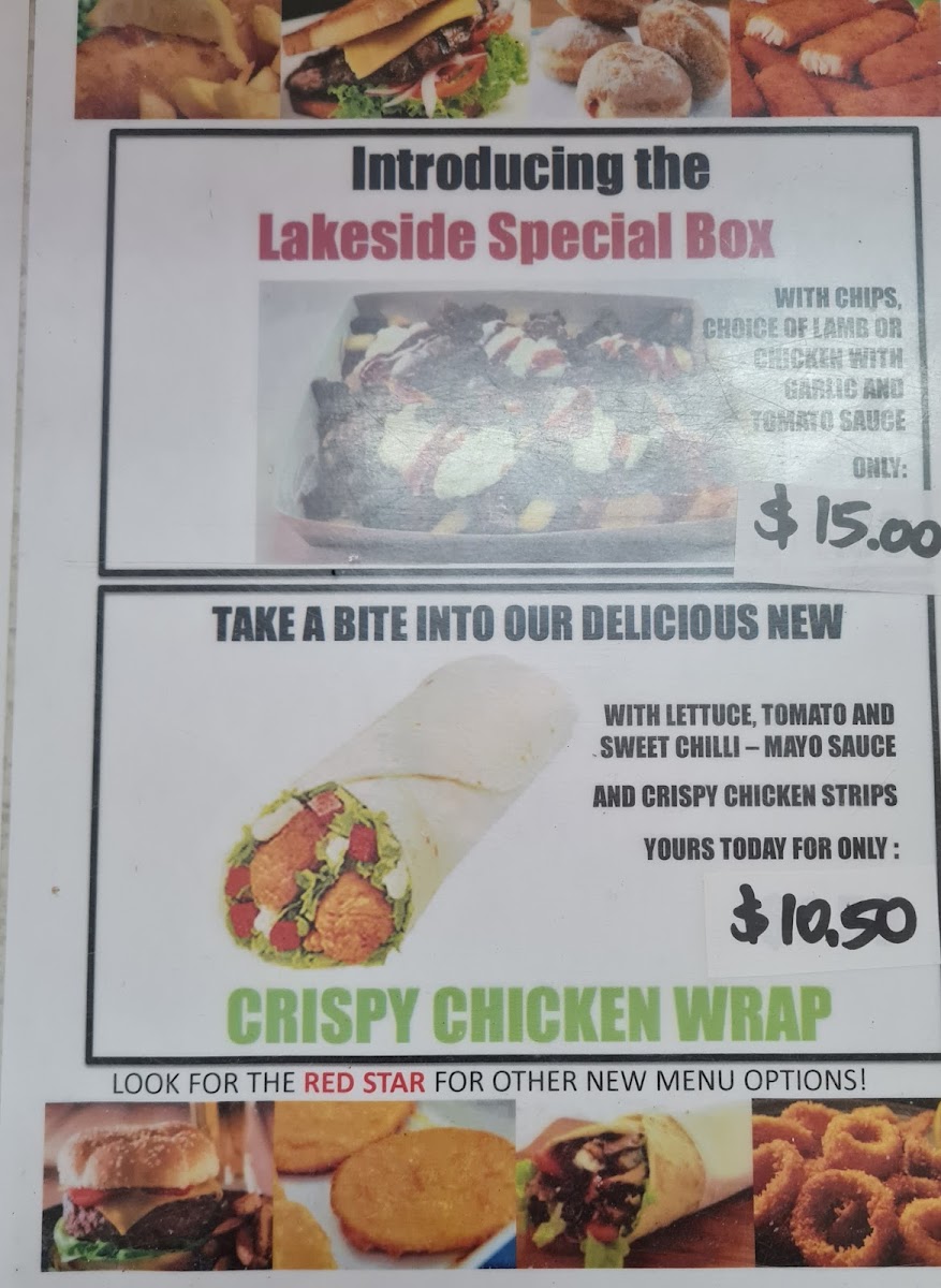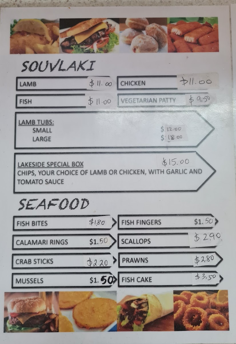The menu at Lakeside Fish & Chips offers a delightful variety of options that cater to different tastes and preferences. For burger enthusiasts, choices like the Chicken Breast Burger and Fish Burger are popular options, with the Eggs and Bacon Sandwich providing a hearty alternative. Vegetarians can enjoy the Vegetarian Patty Burger (V), while seafood lovers can choose from a selection of fish options, such as Flake Fish, Barramundi Fish, and Blue Grenadier Fish. The Fish Souvlaki and Lakeside Special Box are standout items for those seeking a Mediterranean twist, and the Lamb Souvlaki and Chicken Souvlaki also make great options. For sides, the crispy Chips are a classic, and the assortment of Fish Fingers, Scallops, and Calamari Rings makes for a great seafood platter. Customers can complement their meals with a selection of sauces like Garlic Sauce, Tartare Sauce, and Hot Chilli Sauce, while Spring Rolls, Dim Sims in Batter, and Beef Croquettes are perfect for those looking for a snack or extra bite. The restaurant also serves Hot Jam Donuts, Pineapple Fritter, and Churros for those with a sweet tooth. If you're planning a meal for the family, the Family Pack or Mini Pack offer great value. The variety, combined with the casual yet delicious offerings, makes this restaurant a go-to spot for satisfying fish and chip meals.